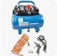 Als Ausstattung besitzt dieser Drucklufterzeuger ein Manometer, Druckminderer, Druckluftkupplung, Sicherheitsventil, Kondenswasserablassventil, Ein-/Ausschalter, integrierter Druckschalter, Ablagefach, Ausblaspistole, 5 m Spiralschlauch, Reifenfüller, Ballfüllnadel, Fahrradventil Adapter und Adapter für Luftmatratzen.